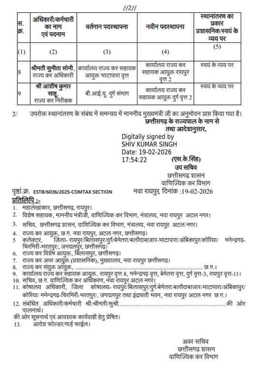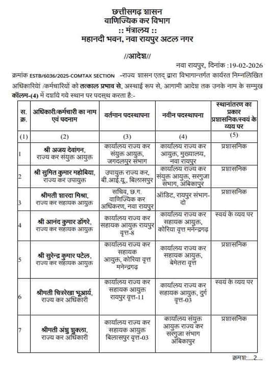 रायपुर ।छत्तीसगढ़ शासन ने प्रशासनिक कसावट और कार्यप्रणाली में सुधार के उद्देश्य से वाणिज्यकर (स्टेट टैक्स) विभाग में व्यापक स्तर पर तबादले किए हैं। इस आदेश के तहत विभिन्न पदों पर कार्यरत अधिकारियों और कर्मचारियों को नई जिम्मेदारियां सौंपी गई हैं।